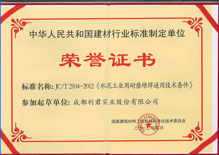 我公司榮獲“中華人民共和國建材行業(yè)標準制定單位榮譽證書”、常務(wù)副總經(jīng)理徐智平先生獲得“JCT2104-2012《水泥工業(yè)用耐磨堆焊通用技術(shù)條件》行業(yè)標準起草人榮譽證書”、項目經(jīng)理鄧四文先生被評為2012年度建材機械行業(yè)標準化先進工作者。