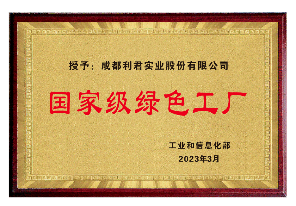 2023年3月,成都利君實(shí)業(yè)股份有限公司榮獲“國(guó)家級(jí)綠色工廠”稱號(hào)。